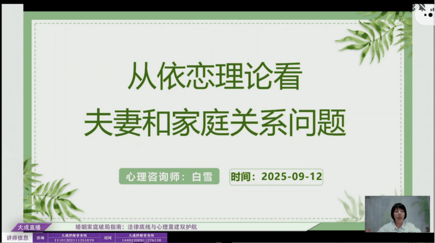 国家二级心理咨询师白雪老师分享的主题是《从依恋理论看夫妻和家庭关系问题》。白雪老师从依恋理论和EFT情绪取向心理治疗的角度出发,分析了再婚夫妻争吵的根本原因、依恋创伤对家庭关系的伤害等问题。依恋对象情绪上的可亲性和回应性可以建立情感联结,有情感联结的时候人就会感觉到安全,当无法获得情绪上的可亲性和回应性时,人们就会激活依恋行为,目的是靠近依恋对象,获得依恋对象的回应。夫妻吵架的根本原因是夫妻之间的情感联结不够牢固和不够安全。依恋创伤会对人与人之间的信任和亲密产生非常大的破坏。家庭的依恋关系出现问题时可以寻求专业的帮助。白雪老师同时分享了解决依恋关系困难的具体方法,助力家庭重建信任与情感联结。