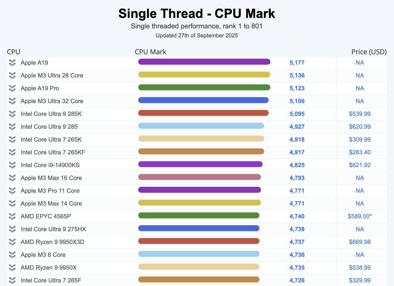 近日,机构PassMark测试了当前的一些主流CPU,对其单核性能进行了排名,可以看到,iPhone 17 上使用的A19 基础款,其单核芯片非常强悍,高达5177分,性能远超了其想象力。
